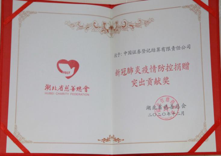 2020年2月,中國結(jié)算向湖北省慈善總會捐贈人民幣3000萬元用于支援湖北省新型肺炎疫情防控工作,其中1000萬元定向支援黃岡市三家定點醫(yī)院(黃岡市中心醫(yī)院400萬元、黃岡市中醫(yī)醫(yī)院300萬元、黃州區(qū)人民醫(yī)院300萬元)。