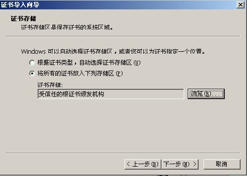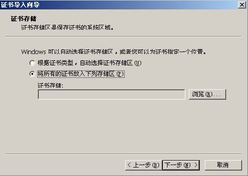 4、上圖中選擇“將所有的證書放入下列存儲區(qū)”,然后點擊“瀏覽”按鈕,進(jìn)入下圖: