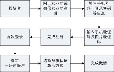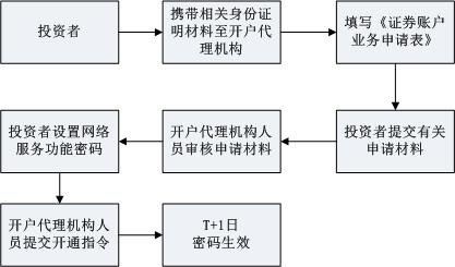 已開證券賬戶的投資者可攜帶有效身份證明文件直接至與其具有委托交易關(guān)系的開戶代理機(jī)構(gòu)或開立相關(guān)證券賬戶的原開戶代理機(jī)構(gòu),申請(qǐng)通過(guò)統(tǒng)一賬戶平臺(tái)提交網(wǎng)絡(luò)用戶開通指令的方式辦理身份認(rèn)證,開通指令提交后次日投資者方可使用其證券賬戶號(hào)及開通時(shí)設(shè)置的初始密碼登錄本公司網(wǎng)站辦理查詢、投票等業(yè)務(wù)。主要流程如下: