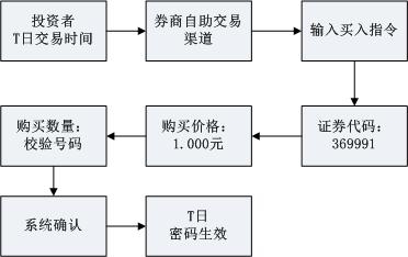交易時(shí)間內(nèi),投資者使用上述證券賬戶通過(guò)證券公司自助交易平臺(tái)(如交易軟件、電話委托交易系統(tǒng)等)以買入指令的方式,輸入證券代碼(369991)、購(gòu)買價(jià)格(密碼激活為1.000元,密碼重置為2.000元)、委托數(shù)量(收到的校驗(yàn)號(hào)碼)后,將買入指令提交至證券公司。圖示如下: